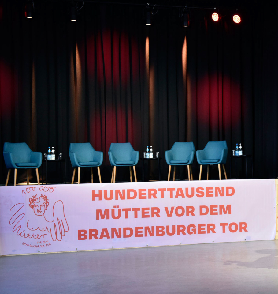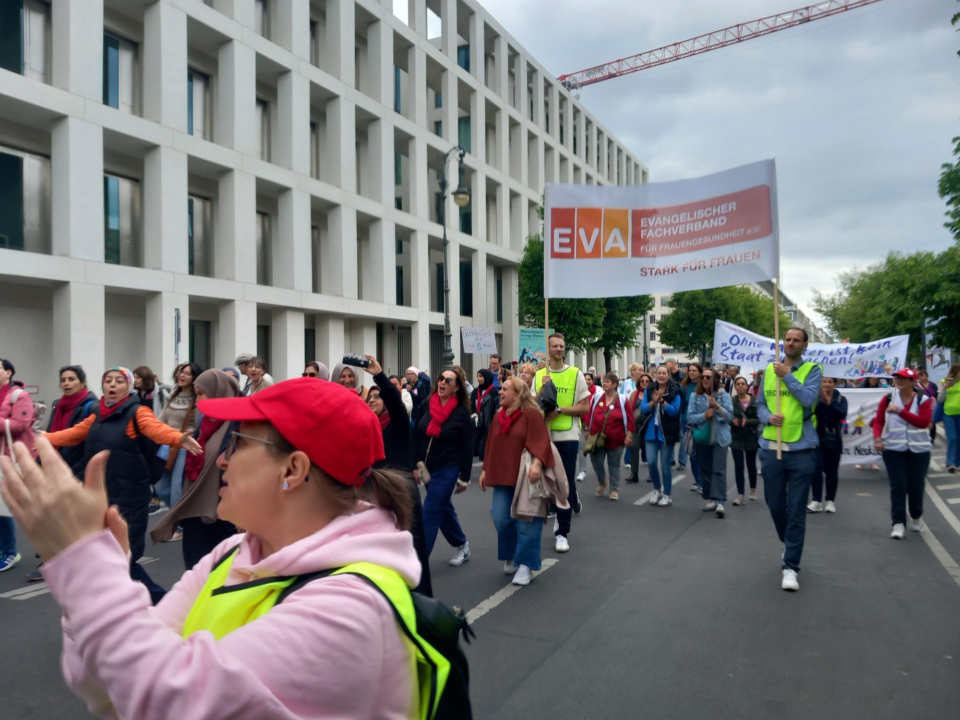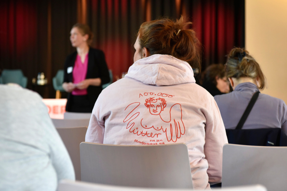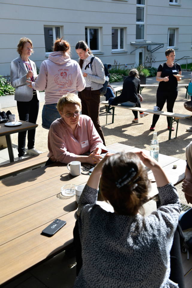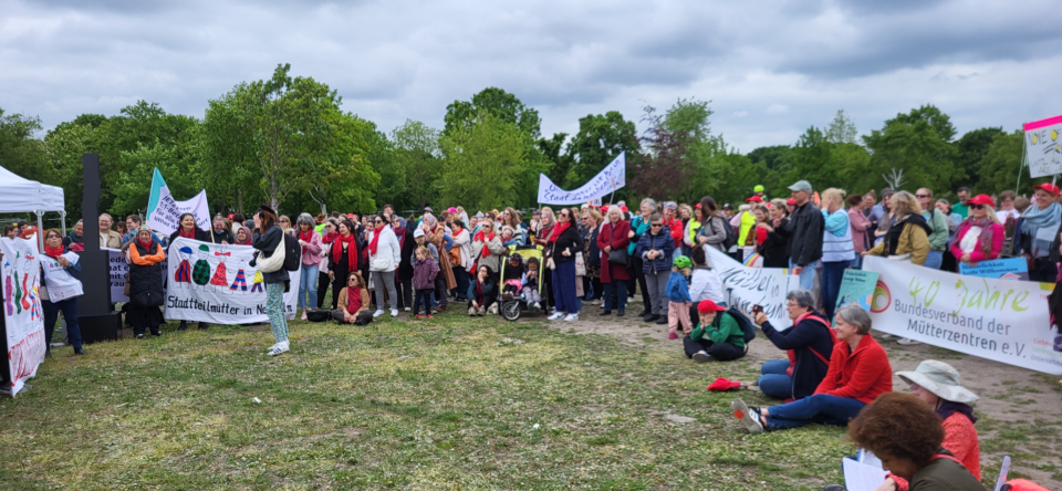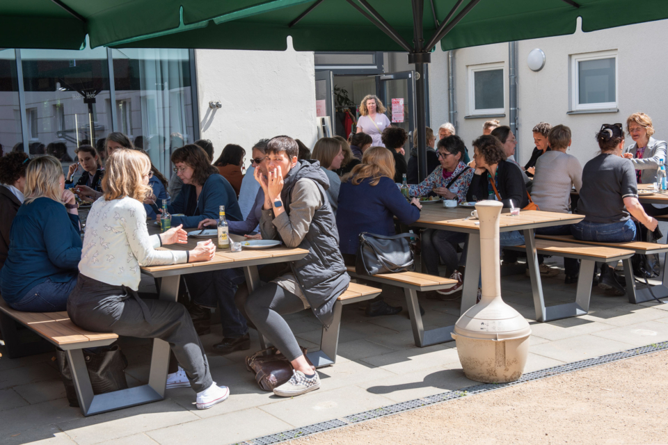 Zwischendurch konnten sich die Teilnehmer*innen am Buffet stärken, die Sonne genießen, am Büchertische stöbern oder caps und T-Shirts der Kampagne „100.000 Mütter vor dem Brandenburger Tor“ erwerben. Die Kampagne war u.A. vom Evangelischen Fachverband für Frauengesundheit mit ins Leben gerufen worden und hatte ihren Höhepunkt am 10. Mai mit einer großen Demonstration mitten im Herzen Berlins. Der Fachtag war ein gelungener Auftakt für den Tag danach: Am 10. Mai wurde die Forderung nach Aufwertung von unbezahlter Sorgearbeit und zur gerechten Verteilung laut und kraftvoll auf die Straße gebracht.