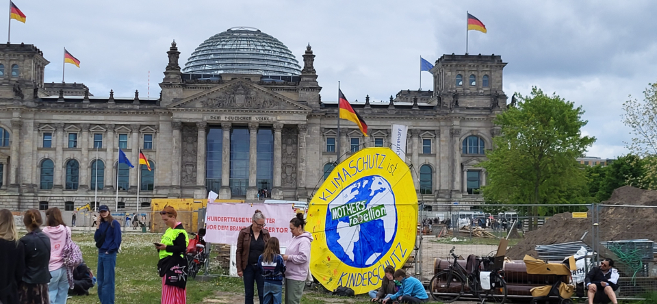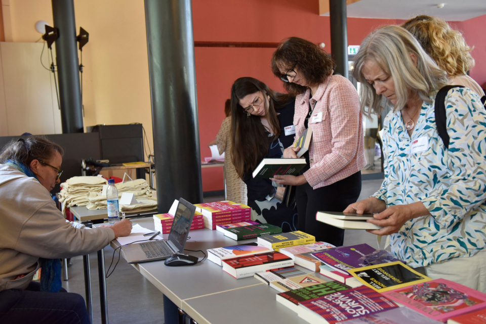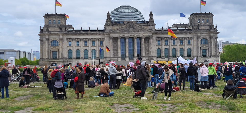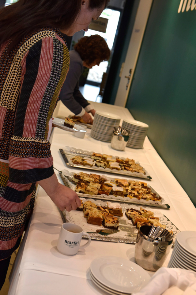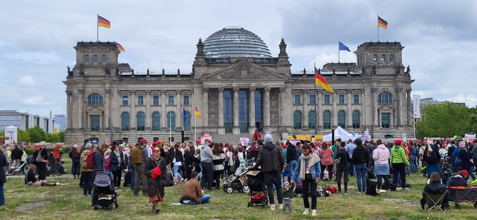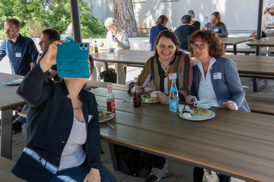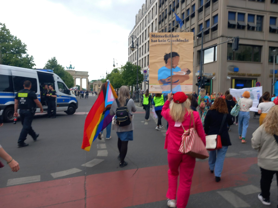 Zwischendurch konnten sich die Teilnehmer*innen am Buffet stärken, die Sonne genießen, am Büchertische stöbern oder caps und T-Shirts der Kampagne „100.000 Mütter vor dem Brandenburger Tor“ erwerben. Die Kampagne war u.A. vom Evangelischen Fachverband für Frauengesundheit mit ins Leben gerufen worden und hatte ihren Höhepunkt am 10. Mai mit einer großen Demonstration mitten im Herzen Berlins. Der Fachtag war ein gelungener Auftakt für den Tag danach: Am 10. Mai wurde die Forderung nach Aufwertung von unbezahlter Sorgearbeit und zur gerechten Verteilung laut und kraftvoll auf die Straße gebracht.